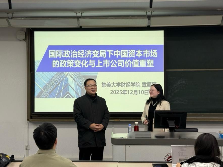 在师生交流环节,章颖薇教授围绕国际政治经济变局下政策调整与企业实践的互动、中国资本市场监管逻辑及投资者结构变化等议题,与在场师生进行了深入的交流与讨论。