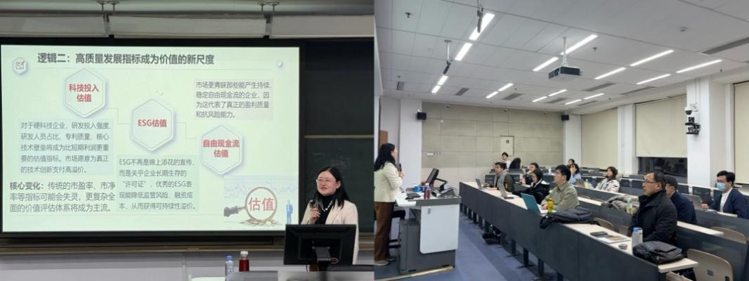 活动伊始,王勇教授对主讲人章颖薇教授作简要介绍。讲座环节,章颖薇教授结合自身研究和工作经历,强调学术研究离不开对现实世界和政策的观察。在此基础上,她首先对当前国际政治经济形势进行分析,指出当下国际政治经济环境并非周期性波动,而是一种结构性变局,地缘政治与安全逻辑正持续重塑全球经济运行规则。其次,她结合近年来政府工作报告和重要会议文件,从中国式现代化、高质量发展与新质生产力等核心概念出发,系统阐释了国际政治经济变局背景下中国发展战略与资本市场重构的逻辑。随后,她围绕多层次资本市场的结构性定位、“新国九条”所体现的治理逻辑转变以及资本市场运行特征与趋势,分析了中国资本市场的政策变化及其战略功能提升。最后,她从上市公司价值重塑的角度探讨了企业如何在新的制度环境下适应国家战略与市场变化,指出企业价值评估正由单一财务导向转向更加重视战略方向、创新能力和长期确定性的综合判断。