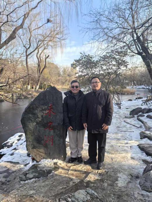 在王勇教授的欢迎致辞后,代表团在陪同下参观校园。初雪后的燕园素净清雅,未名湖面的薄冰映照着冬日晴空,博雅塔在积雪的勾勒下更显古朴典雅。王勇教授向来宾介绍了北京大学燕园校区与圆明园等皇家园林、多座清代皇家赐园等的关系,并为大家一一介绍了第二教学楼、理科楼群、数学学院大楼、光华管理学院大楼以及北京大学图书馆等现代化教学科研设施。最后来宾们参观了未名湖及周边景观。